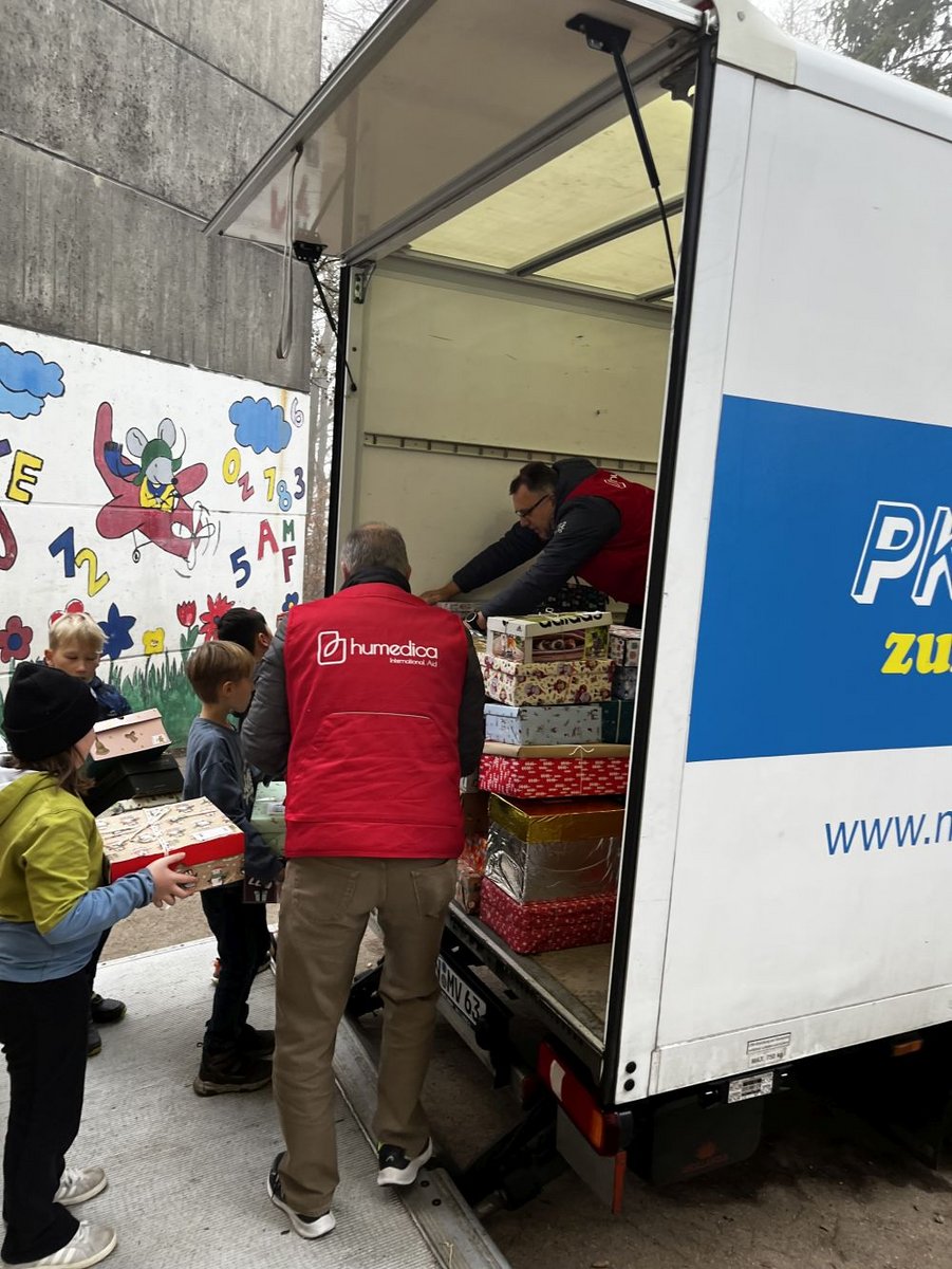 Wie jedes Jahr, beteiligen wir uns außerdem wieder an der Weihnachtspäckchen-Aktion für Humedica. Wir konnten den ehrenamtlichen Helfern von Humedica112 Pakete übergeben, die an hilfsbedürftige Kinder in Osteuropa gebracht werden.