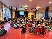 Auf dem Flur waren Schellen zu hören. Das wird doch nicht etwa ... Genau! Der Bischof Nikolaus betrat zusammen mit dem Knecht Ruprecht und einem Engelchen die Aula und besuchte die Grundschulkinder. Nach der Begrüßung mit einem Adventslied sprach der Nikolaus mit den Kindern über den Bischof Nikolaus von Myra und die guten Taten, die dieser für die Menschen vollbracht hatte. Anschließend öffnete der Nikolaus sein großes goldenes Buch und las jeder Jahrgangsstufe vor, was schon sehr gut klappt und was man noch etwas üben muss.