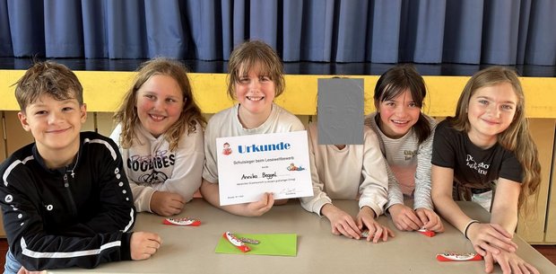 Mara Lukschandel, Elias Erdle, Helena Greither (Vorlesesiegerin), Mia Freimuth, Simon Mang